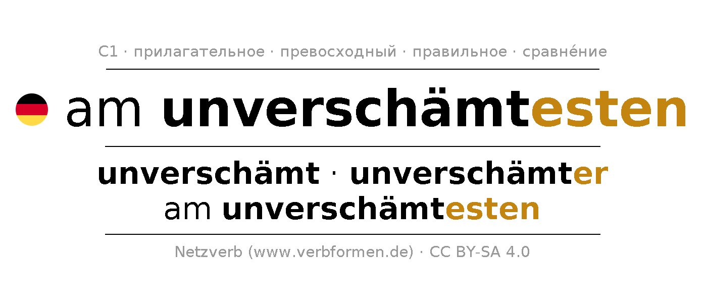 Прилагательное склоняется am unverschämtesten (наглый, дерзкий) и в степенях сравнения unverschämt,unverschämter,am unverschämtesten . Формы сравнительной и превосходной степеней прилагательного имеют следующие суффиксы er/esten. Прилагательное am unverschämtesten может употребляться как в качестве определения перед существительным (с артиклем и без него, в формах сильного, слабого и смешанного склонений), так и в качестве именной части сказуемого в сочетании с глаголом.Можно не только отразить и сравнить am unverschämtesten, но и все немецкие прилагательные. Kомментарии ☆