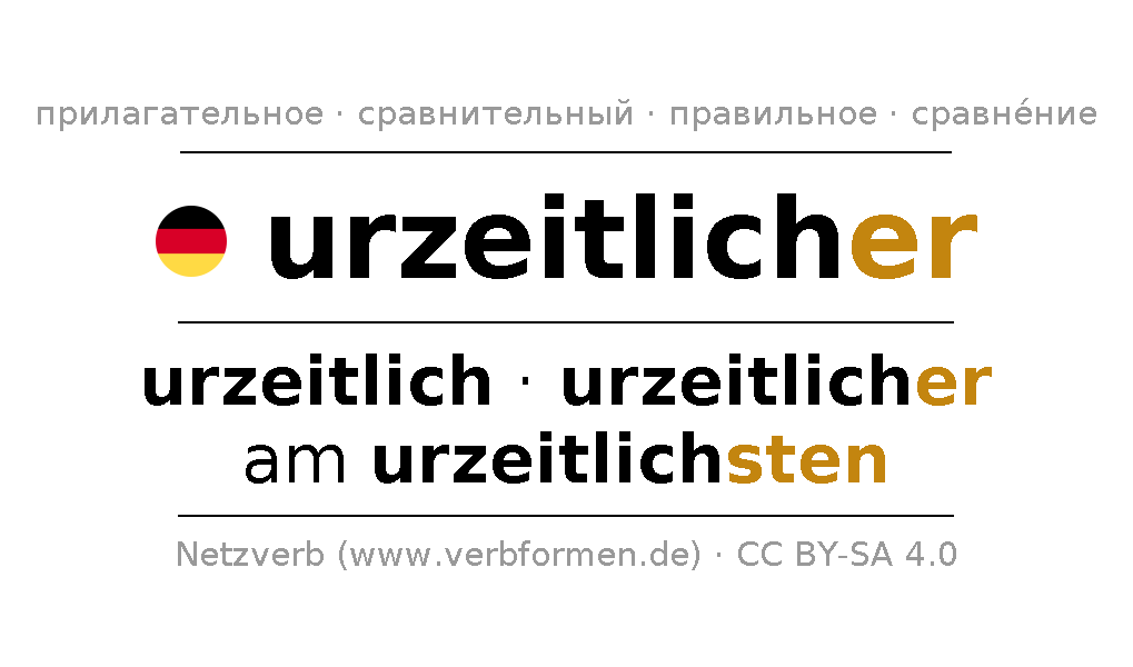 Прилагательное склоняется urzeitlicher (древний, первобытный) и в степенях сравнения urzeitlich,urzeitlicher,am urzeitlichsten . Формы сравнительной и превосходной степеней прилагательного имеют следующие суффиксы er/sten. Прилагательное urzeitlicher может употребляться как в качестве определения перед существительным (с артиклем и без него, в формах сильного, слабого и смешанного склонений), так и в качестве именной части сказуемого в сочетании с глаголом.Можно не только отразить и сравнить urzeitlicher, но и все немецкие прилагательные. Kомментарии ☆