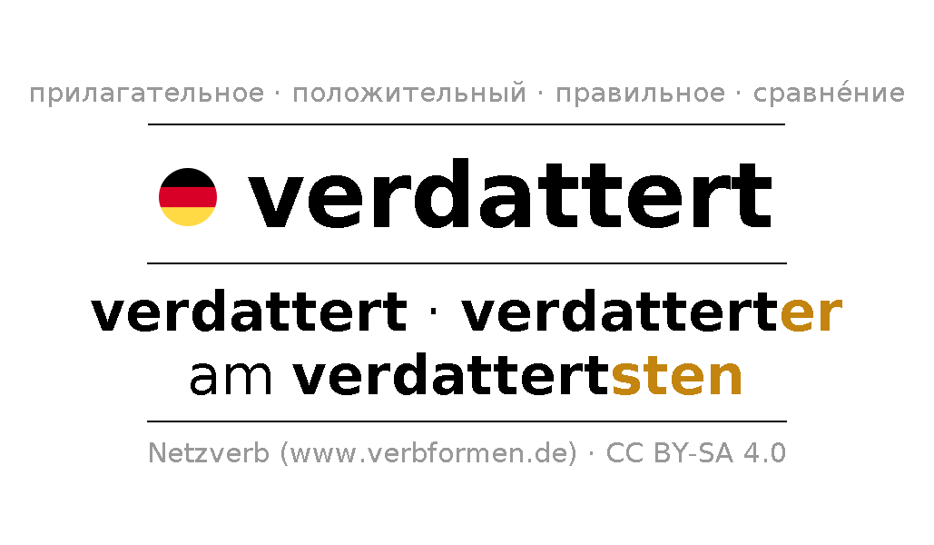Склонение и степени сравнения verdattert онлайн в виде таблиц, содержащих все формы сильного, слабого и смешанного склонений. Для наглядности они сведены в одну общую таблицу, в которой представлены формы единственного (Singular) и множественного (Plural) числа всех четырёх падежей: именительного (номинатив или 1-й падеж - кто? что?), родительного (генитив или 2-й падеж - кого? чего? чей?), дательного (датив или 3-й падеж - кому? чему?) и винительного (аккузатив или 4-й падеж - кого? что?). Более подробную информацию Вы найдёте на ... викисловаря ... и на ... в Дудене.