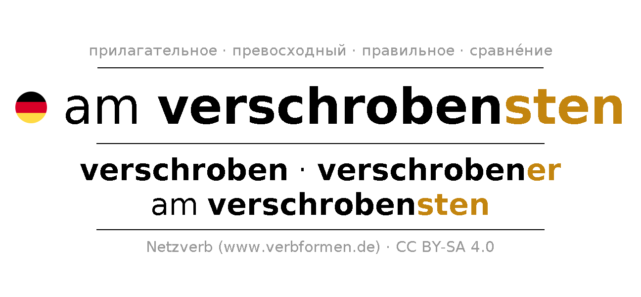 Прилагательное склоняется am verschrobensten (необычный, странный) и в степенях сравнения verschroben,verschrobener,am verschrobensten . Формы сравнительной и превосходной степеней прилагательного имеют следующие суффиксы er/sten. Прилагательное am verschrobensten может употребляться как в качестве определения перед существительным (с артиклем и без него, в формах сильного, слабого и смешанного склонений), так и в качестве именной части сказуемого в сочетании с глаголом.Можно не только отразить и сравнить am verschrobensten, но и все немецкие прилагательные. Kомментарии ☆