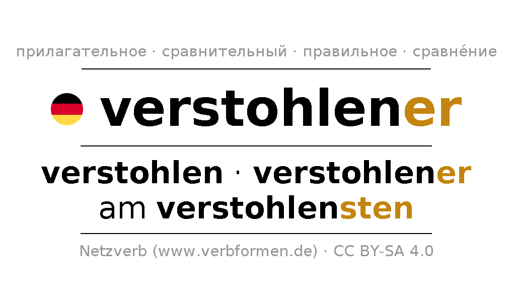 Прилагательное склоняется verstohlener (незаметный, скрытный) и в степенях сравнения verstohlen,verstohlener,am verstohlensten . Формы сравнительной и превосходной степеней прилагательного имеют следующие суффиксы er/sten. Прилагательное verstohlener может употребляться как в качестве определения перед существительным (с артиклем и без него, в формах сильного, слабого и смешанного склонений), так и в качестве именной части сказуемого в сочетании с глаголом.Можно не только отразить и сравнить verstohlener, но и все немецкие прилагательные. Kомментарии ☆