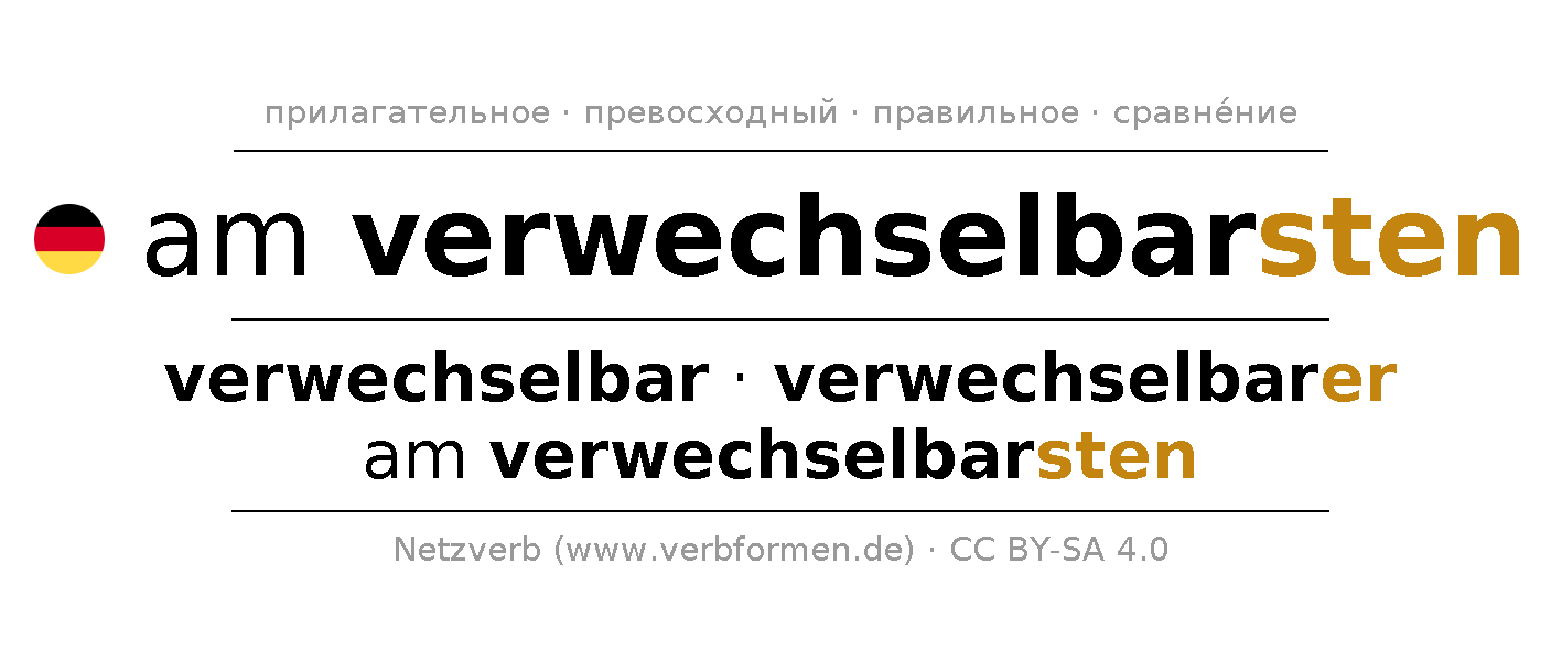 Прилагательное склоняется am verwechselbarsten (путаный, смешиваемый) и в степенях сравнения verwechselbar,verwechselbarer,am verwechselbarsten . Формы сравнительной и превосходной степеней прилагательного имеют следующие суффиксы er/sten. Прилагательное am verwechselbarsten может употребляться как в качестве определения перед существительным (с артиклем и без него, в формах сильного, слабого и смешанного склонений), так и в качестве именной части сказуемого в сочетании с глаголом.Можно не только отразить и сравнить am verwechselbarsten, но и все немецкие прилагательные. Kомментарии ☆