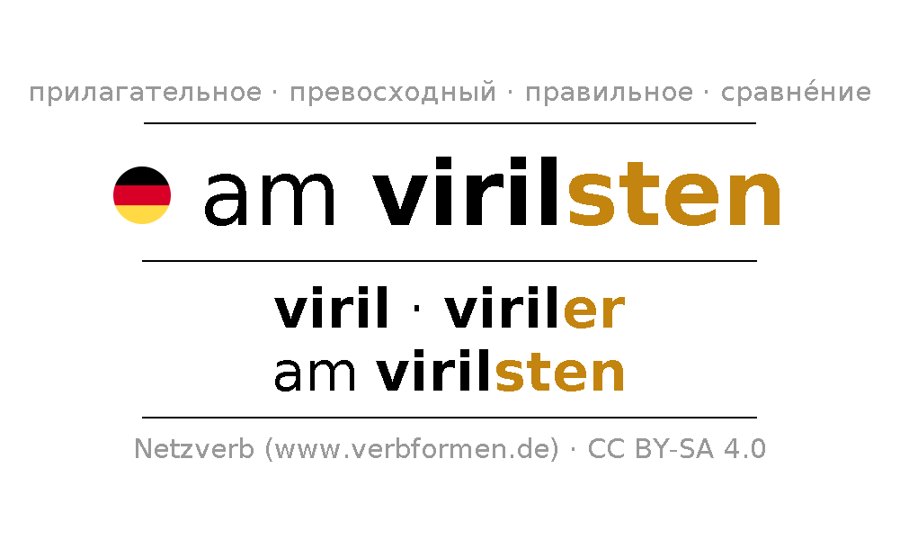 Прилагательное склоняется am virilsten (мужественный, мужской) и в степенях сравнения viril,viriler,am virilsten . Формы сравнительной и превосходной степеней прилагательного имеют следующие суффиксы er/sten. Прилагательное am virilsten может употребляться как в качестве определения перед существительным (с артиклем и без него, в формах сильного, слабого и смешанного склонений), так и в качестве именной части сказуемого в сочетании с глаголом.Можно не только отразить и сравнить am virilsten, но и все немецкие прилагательные. Kомментарии ☆