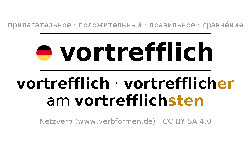 Склонение и степени сравнения vortrefflich онлайн в виде таблиц, содержащих все формы сильного, слабого и смешанного склонений. Для наглядности они сведены в одну общую таблицу, в которой представлены формы единственного (Singular) и множественного (Plural) числа всех четырёх падежей: именительного (номинатив или 1-й падеж - кто? что?), родительного (генитив или 2-й падеж - кого? чего? чей?), дательного (датив или 3-й падеж - кому? чему?) и винительного (аккузатив или 4-й падеж - кого? что?). Более подробную информацию Вы найдёте на ... викисловаря ... и на ... в Дудене.