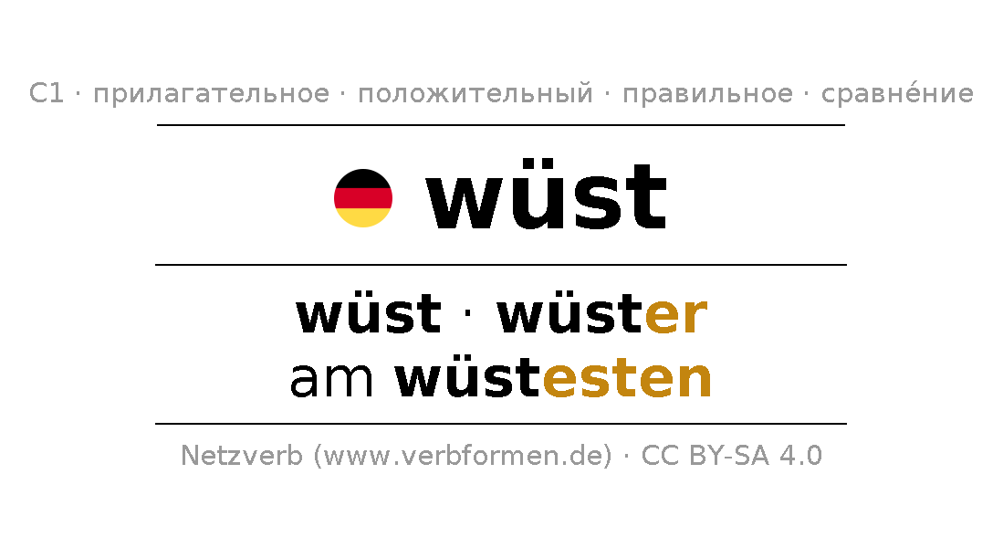 Прилагательное склоняется wüst (аморальный, безлюдный) и в степенях сравнения wüst,wüster,am wüstesten . Формы сравнительной и превосходной степеней прилагательного имеют следующие суффиксы er/esten. Прилагательное wüst может употребляться как в качестве определения перед существительным (с артиклем и без него, в формах сильного, слабого и смешанного склонений), так и в качестве именной части сказуемого в сочетании с глаголом.Можно не только отразить и сравнить wüst, но и все немецкие прилагательные. Kомментарии ☆