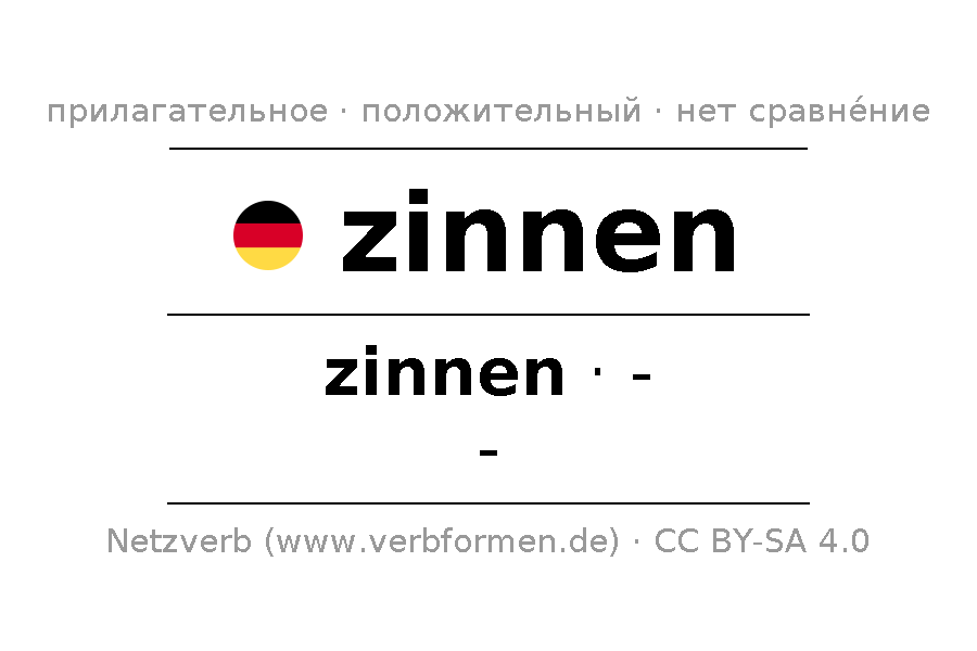 Склонение и степени сравнения zinnen онлайн в виде таблиц, содержащих все формы сильного, слабого и смешанного склонений. Для наглядности они сведены в одну общую таблицу, в которой представлены формы единственного (Singular) и множественного (Plural) числа всех четырёх падежей: именительного (номинатив или 1-й падеж - кто? что?), родительного (генитив или 2-й падеж - кого? чего? чей?), дательного (датив или 3-й падеж - кому? чему?) и винительного (аккузатив или 4-й падеж - кого? что?). Более подробную информацию Вы найдёте на ... викисловаря ... и на ... в Дудене.