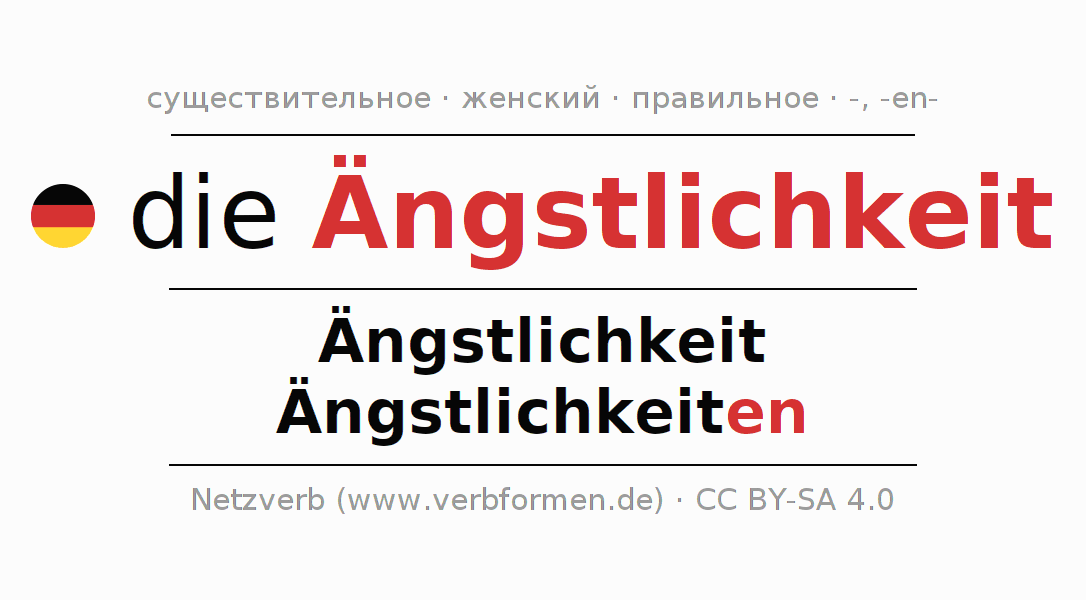 - Единственное число: die Ängstlichkeit, der Ängstlichkeit, der Ängstlichkeit, die Ängstlichkeit
