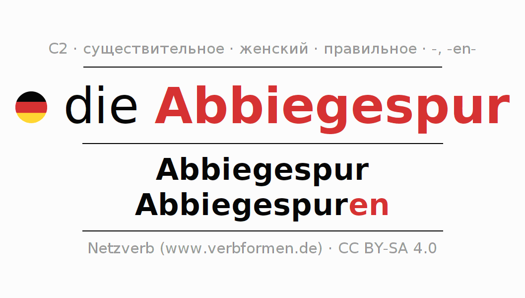 - Множественное число: die Abbiegespuren, der Abbiegespuren, den Abbiegespuren, die Abbiegespuren