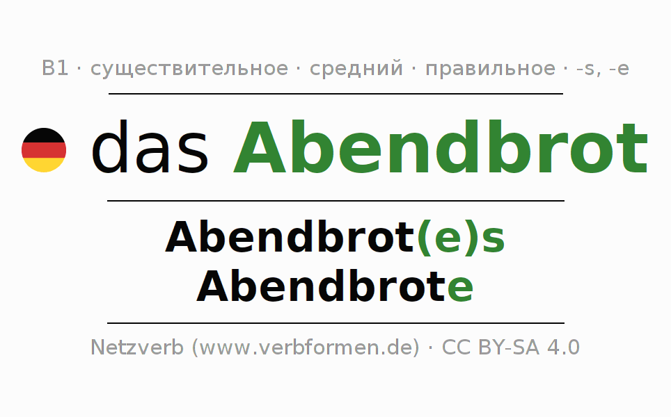 Склонение существительного Abendbrot (ужин, вечерняя еда) даётся в родительном падеже единственного числаAbendbrot(e)s и в именительном падеже множественного числа Abendbrote. Существительное Abendbrot склоняется по сильному типу, получая окончания es/e. Грамматический род Abendbrot средний с определённым артиклем "das" Здесь можно просклонять не только Abendbrot, но и все немецкие существительные. Существительное включён в словарный запас обладателя сертификата знания немецкого языка уровня B1. Kомментарии ☆