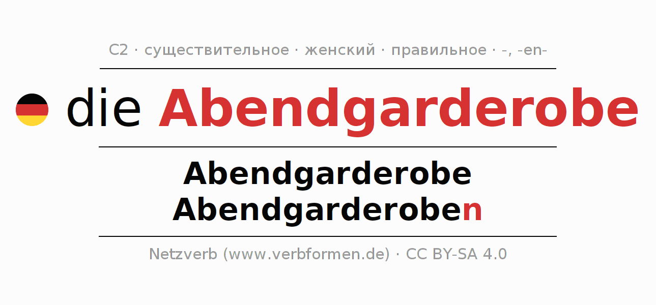 Склонение существительного Abendgarderobe (вечерняя одежда) даётся в родительном падеже единственного числаAbendgarderobe и в именительном падеже множественного числа Abendgarderoben. Существительное Abendgarderobe склоняется по слабому типу, получая окончания -/n. Грамматический род Abendgarderobe женский с определённым артиклем "die" Здесь можно просклонять не только Abendgarderobe, но и все немецкие существительные. Существительное включён в словарный запас обладателя сертификата знания немецкого языка уровня C2. Kомментарии ☆
