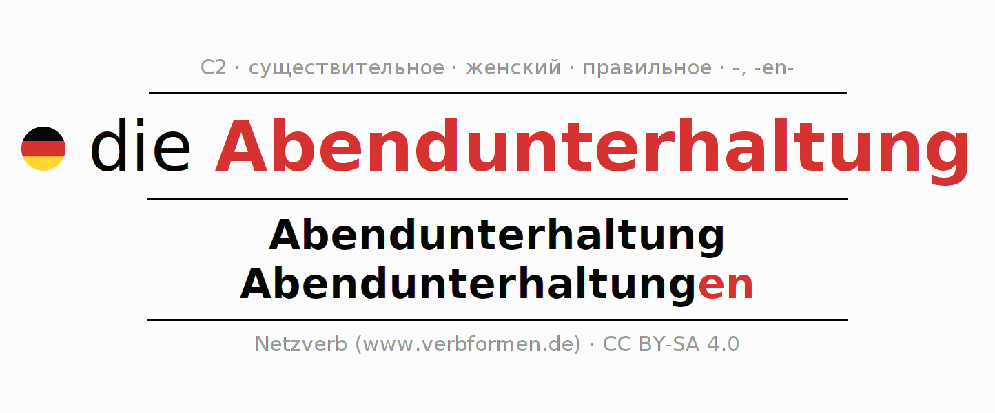 - Единственное число: die Abendunterhaltung, der Abendunterhaltung, der Abendunterhaltung, die Abendunterhaltung