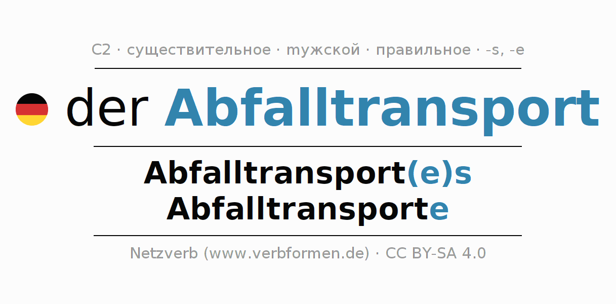 - Единственное число: der Abfalltransport, des Abfalltransport(e)s, dem Abfalltransport(e), den Abfalltransport
