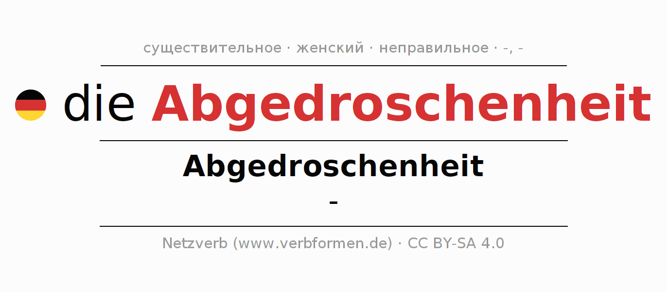 Склонение существительного Abgedroschenheit (бана́льность, банальность) даётся в родительном падеже единственного числаAbgedroschenheit и в именительном падеже множественного числа -. Существительное Abgedroschenheit при склонении получает окончания -/-. Не образует форм множественного числа. Грамматический род Abgedroschenheit женский с определённым артиклем "die" Здесь можно просклонять не только Abgedroschenheit, но и все немецкие существительные. Kомментарии ☆