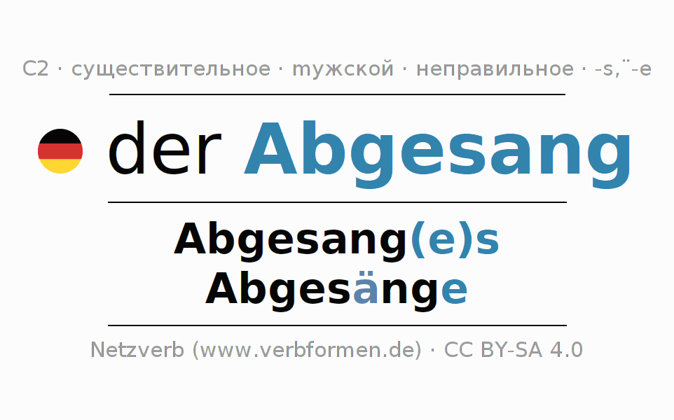 Склонение существительного Abgesang (заключи́тельная речь, заключительная часть) даётся в родительном падеже единственного числаAbgesang(e)s и в именительном падеже множественного числа Abgesänge. Существительное Abgesang склоняется по сильному типу, получая окончания es/ä-e. Во множественном числе стоит умлаут. Грамматический род Abgesang мужской с определённым артиклем "der" Здесь можно просклонять не только Abgesang, но и все немецкие существительные. Существительное включён в словарный запас обладателя сертификата знания немецкого языка уровня C2. Kомментарии ☆