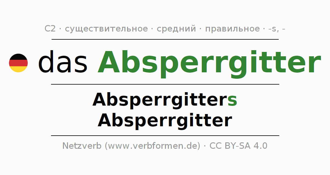 Склонение слова Absperrgitter онлайн представлено в виде сводной таблицы со всеми формами единственного и множественного числа (множественное число) во всех четырех падежах - именительном (номинатив или 1-й падеж - кто? что?), родительном (генитив или 2-й падеж - кого? чего? чей?), дательном (датив или 3-й падеж - кому? чему?) и винительном (аккузатив или 4-й падеж - кого? что?). Материалы по склонению существительного ... могут быть использованы в качестве пособия при подготовке домашних заданий, проведении экзаменов, контрольных работ, при преподавании немецкого языка в школе, изучении немецкого языка как иностранного (DaF) и как второго (DaZ), а также при обучении взрослых. Для изучающих немецкий язык знание правильного склонения слова Absperrgitter имеет важное значение. Более подробную информацию Вы найдёте на ... викисловаря ... и на ... в Дудене.