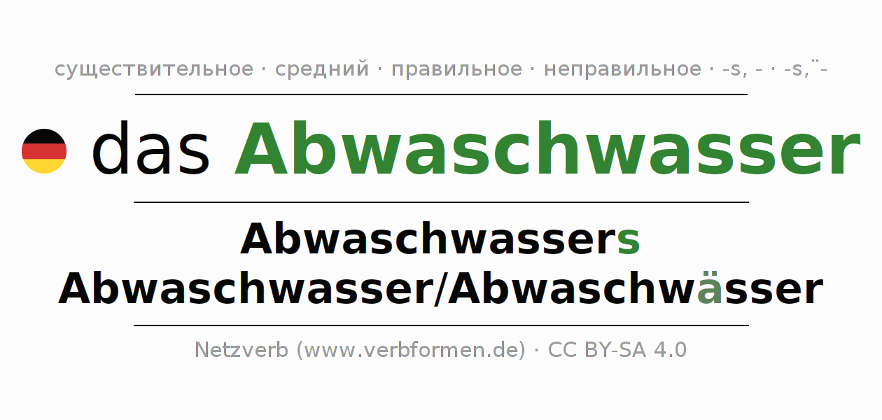 - Единственное число: das Abwaschwasser, des Abwaschwassers, dem Abwaschwasser, das Abwaschwasser
