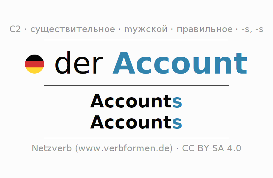 - Множественное число: die Accounts, der Accounts, den Accounts, die Accounts