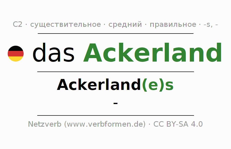Склонение существительного Ackerland (обрабатываемая земля, па́хотная земля́) даётся в родительном падеже единственного числаAckerland(e)s и в именительном падеже множественного числа -. Существительное Ackerland склоняется по сильному типу, получая окончания es/-. Не образует форм множественного числа. Грамматический род Ackerland средний с определённым артиклем "das" Здесь можно просклонять не только Ackerland, но и все немецкие существительные. Существительное включён в словарный запас обладателя сертификата знания немецкого языка уровня C2. Kомментарии ☆