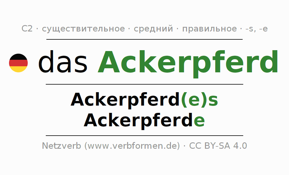 Склонение существительного Ackerpferd (рабочая лошадь, рабо́чая ло́шадь) даётся в родительном падеже единственного числаAckerpferd(e)s и в именительном падеже множественного числа Ackerpferde. Существительное Ackerpferd склоняется по сильному типу, получая окончания es/e. Грамматический род Ackerpferd средний с определённым артиклем "das" Здесь можно просклонять не только Ackerpferd, но и все немецкие существительные. Существительное включён в словарный запас обладателя сертификата знания немецкого языка уровня C2. Kомментарии ☆