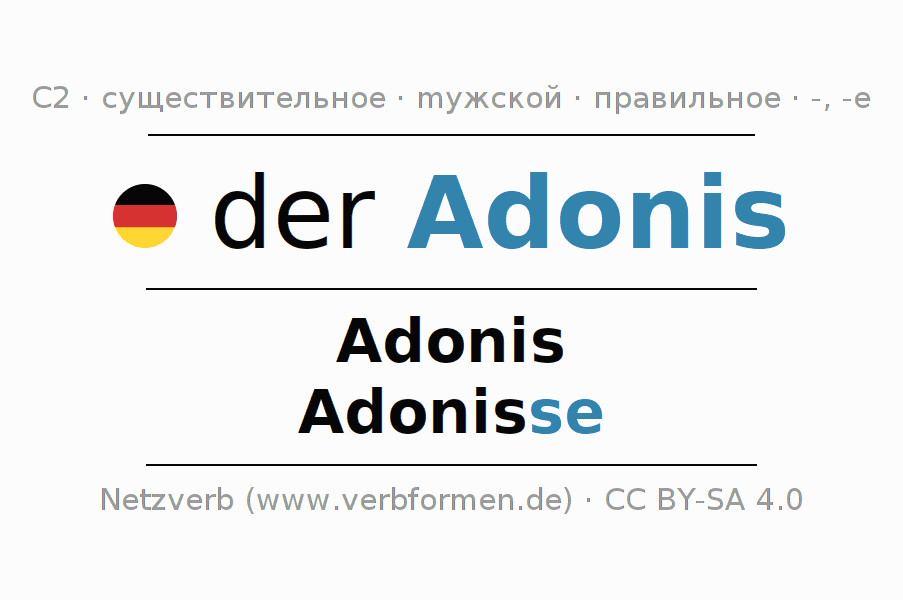 - Единственное число: der Adonis, des Adonis, dem Adonis, den Adonis