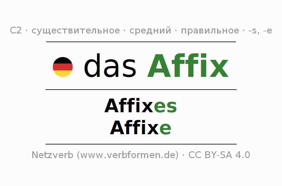 - Единственное число: das Affix, des Affixes, dem Affix(e), das Affix