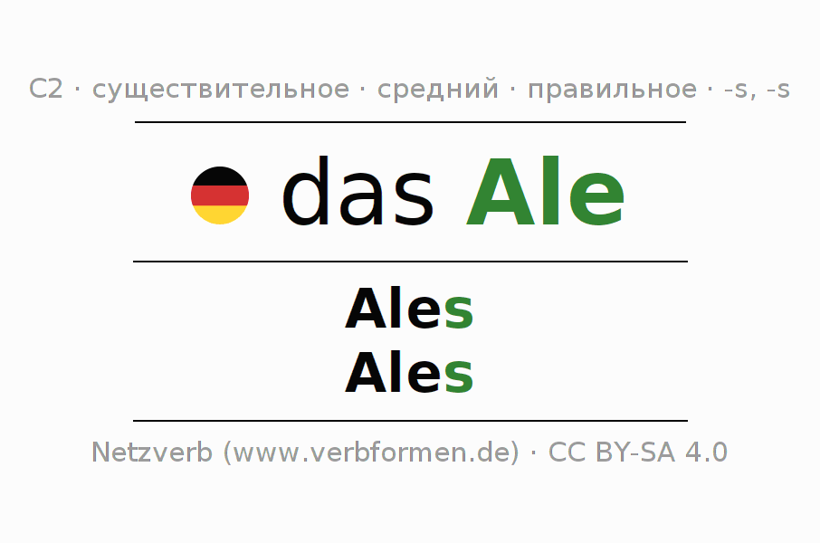 Склонение существительного Ale (эль, светлое пиво) даётся в родительном падеже единственного числаAles и в именительном падеже множественного числа Ales. Существительное Ale склоняется по сильному типу, получая окончания s/s. Грамматический род Ale средний с определённым артиклем "das" Здесь можно просклонять не только Ale, но и все немецкие существительные. Существительное включён в словарный запас обладателя сертификата знания немецкого языка уровня C2. Kомментарии ☆