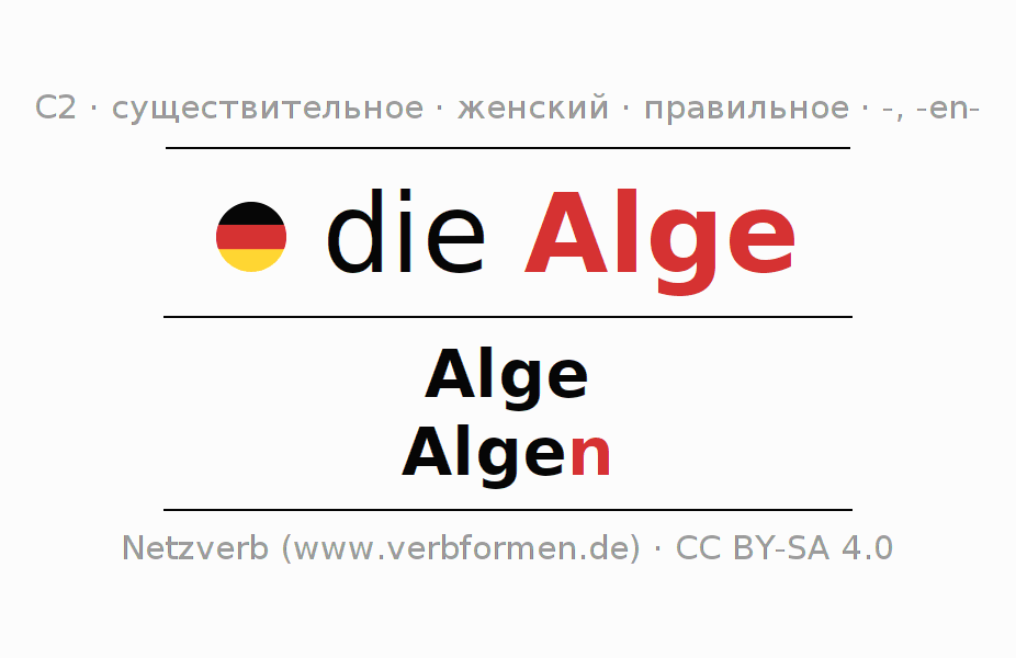 - Единственное число: die Alge, der Alge, der Alge, die Alge