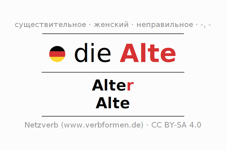 Склонение существительного Alte даётся в родительном падеже единственного числаAlter и в именительном падеже множественного числа Alte. Существительное Alte при склонении получает окончания -/-. Грамматический род Alte женский с определённым артиклем "die" Однако существительное может употребляться в другом роде и с другим артиклем. Здесь можно просклонять не только Alte, но и все немецкие существительные. Kомментарии ☆