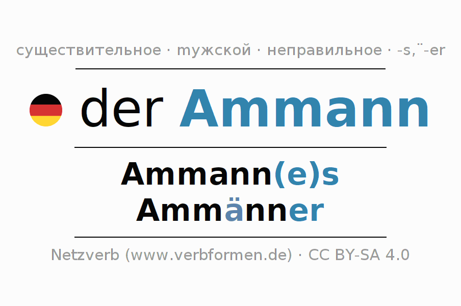 Склонение существительного Ammann (мэр, окружно́й нача́льник) даётся в родительном падеже единственного числаAmmann(e)s и в именительном падеже множественного числа Ammänner. Существительное Ammann склоняется по сильному типу, получая окончания es/ä-er. Во множественном числе стоит умлаут. Грамматический род Ammann мужской с определённым артиклем "der" Здесь можно просклонять не только Ammann, но и все немецкие существительные. Kомментарии ☆