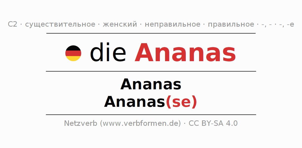 - Единственное число: die Ananas, der Ananas, der Ananas, die Ananas