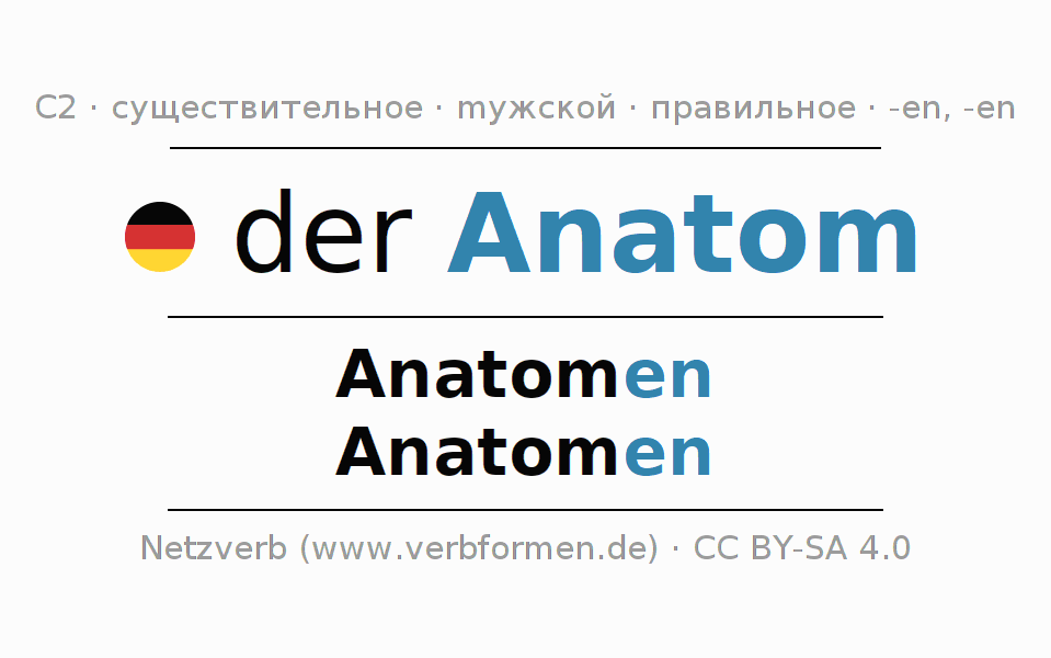 - Единственное число: der Anatom, des Anatomen, dem Anatomen, den Anatomen