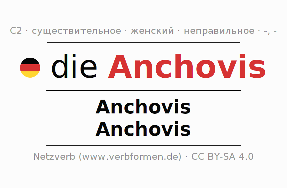 - Множественное число: die Anchovis, der Anchovis, den Anchovis, die Anchovis
