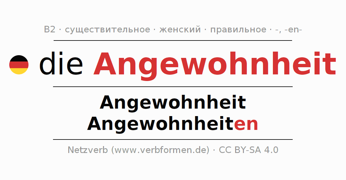 - Множественное число: die Angewohnheiten, der Angewohnheiten, den Angewohnheiten, die Angewohnheiten