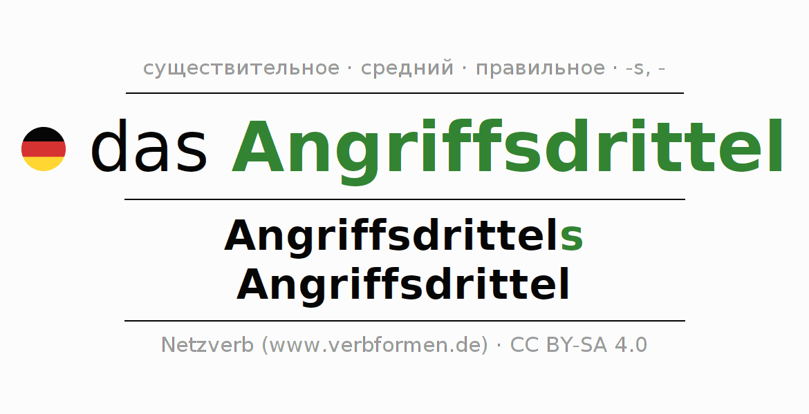Склонение существительного Angriffsdrittel (атакующая зона, нападение) даётся в родительном падеже единственного числаAngriffsdrittels и в именительном падеже множественного числа Angriffsdrittel. Существительное Angriffsdrittel склоняется по сильному типу, получая окончания s/-. Грамматический род Angriffsdrittel средний с определённым артиклем "das" Здесь можно просклонять не только Angriffsdrittel, но и все немецкие существительные. Kомментарии ☆