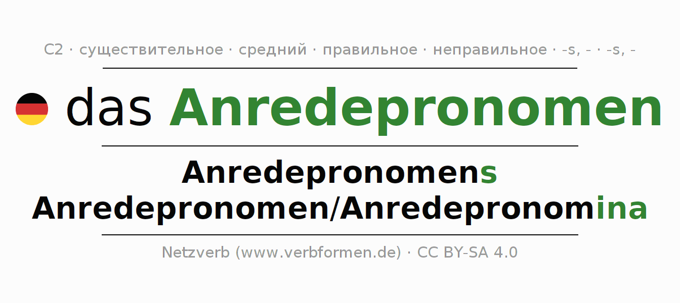 - Единственное число: das Anredepronomen, des Anredepronomens, dem Anredepronomen, das Anredepronomen