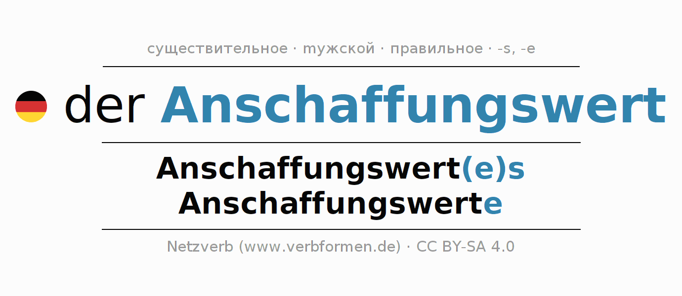 - Множественное число: die Anschaffungswerte, der Anschaffungswerte, den Anschaffungswerten, die Anschaffungswerte