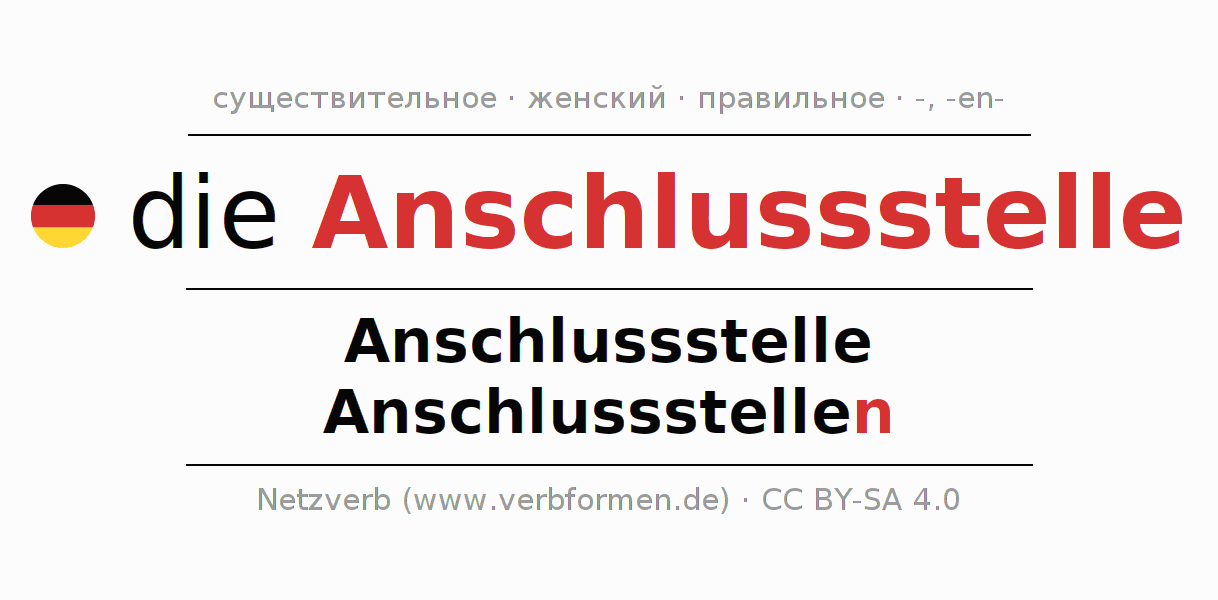 - Множественное число: die Anschlussstellen, der Anschlussstellen, den Anschlussstellen, die Anschlussstellen