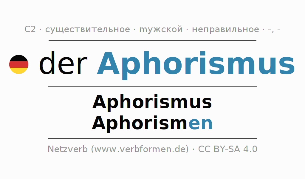 - Множественное число: die Aphorismen, der Aphorismen, den Aphorismen, die Aphorismen