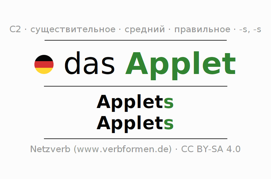 - Множественное число: die Applets, der Applets, den Applets, die Applets