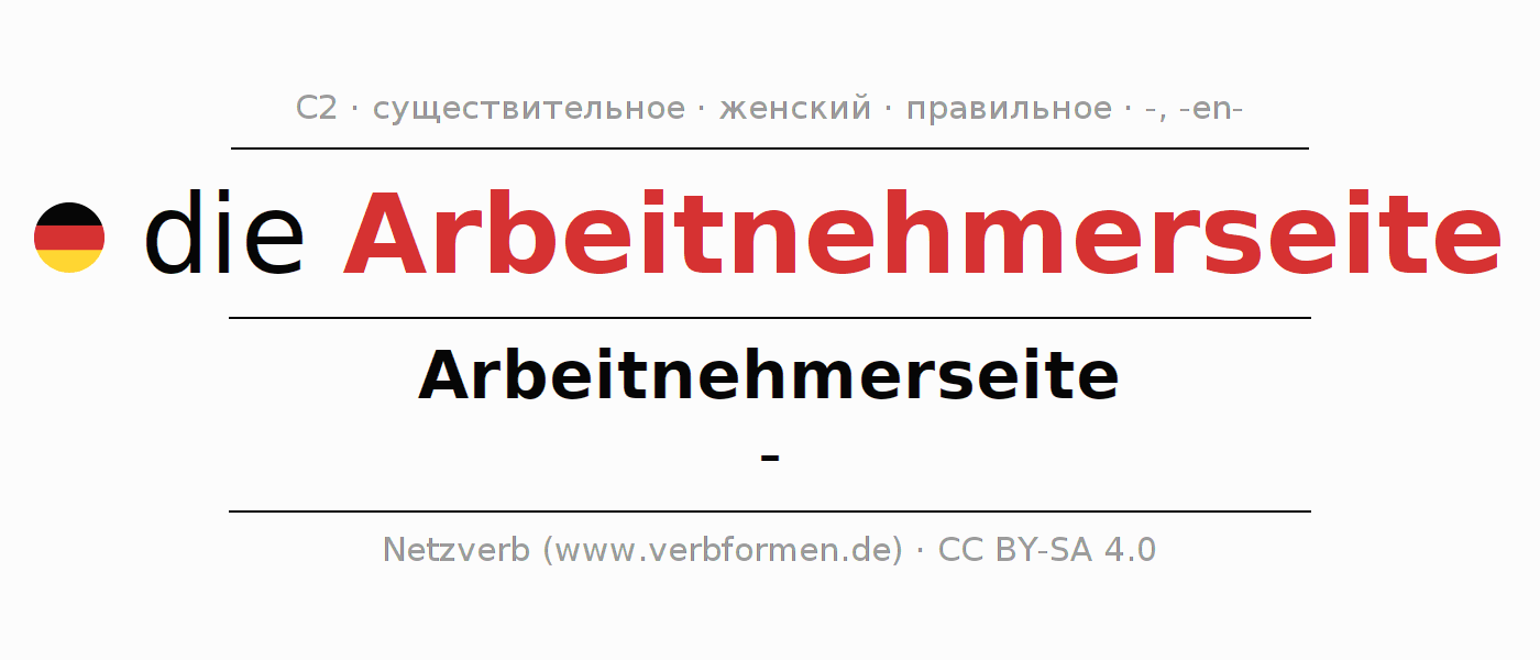 - Единственное число: die Arbeitnehmerseite, der Arbeitnehmerseite, der Arbeitnehmerseite, die Arbeitnehmerseite