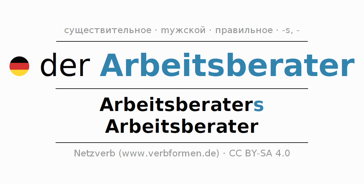 - Множественное число: die Arbeitsberater, der Arbeitsberater, den Arbeitsberatern, die Arbeitsberater