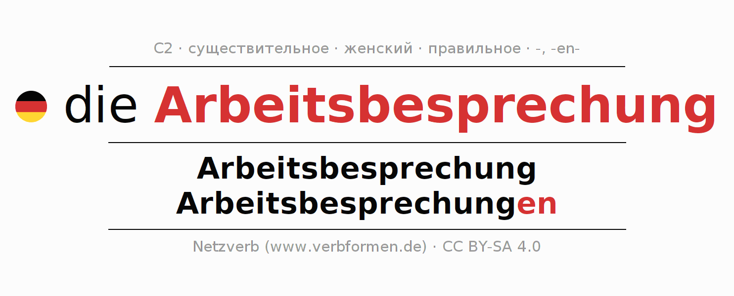 - Единственное число: die Arbeitsbesprechung, der Arbeitsbesprechung, der Arbeitsbesprechung, die Arbeitsbesprechung