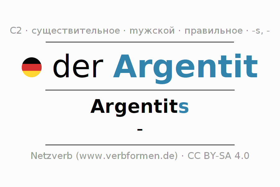 Склонение существительного Argentit (аргентит, аргенти́т) даётся в родительном падеже единственного числаArgentits и в именительном падеже множественного числа -. Существительное Argentit склоняется по сильному типу, получая окончания s/-. Не образует форм множественного числа. Грамматический род Argentit мужской с определённым артиклем "der" Здесь можно просклонять не только Argentit, но и все немецкие существительные. Существительное включён в словарный запас обладателя сертификата знания немецкого языка уровня C2. Kомментарии ☆