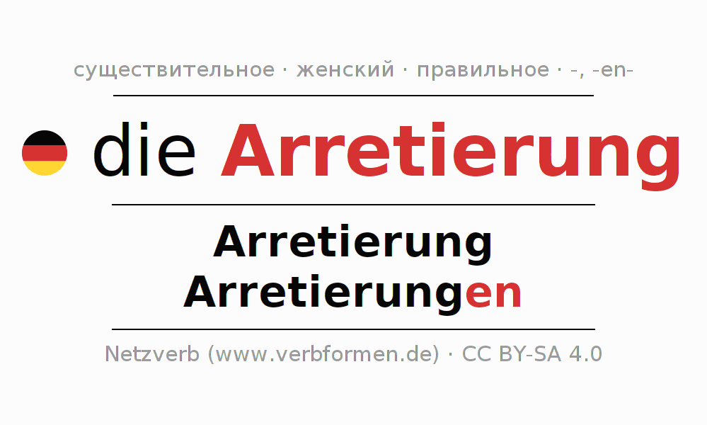 - Множественное число: die Arretierungen, der Arretierungen, den Arretierungen, die Arretierungen