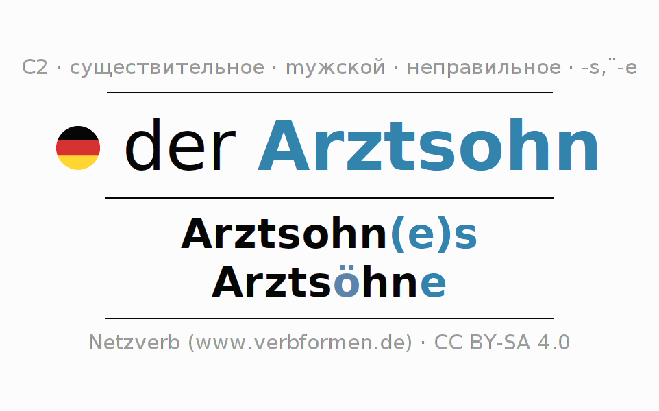 - Множественное число: die Arztsöhne, der Arztsöhne, den Arztsöhnen, die Arztsöhne
