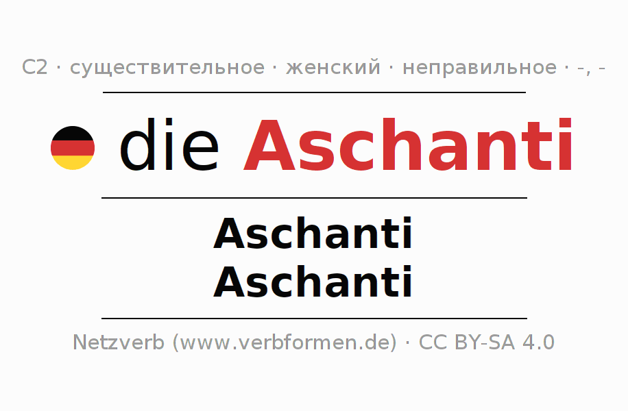 - Множественное число: die Aschanti, der Aschanti, den Aschanti, die Aschanti