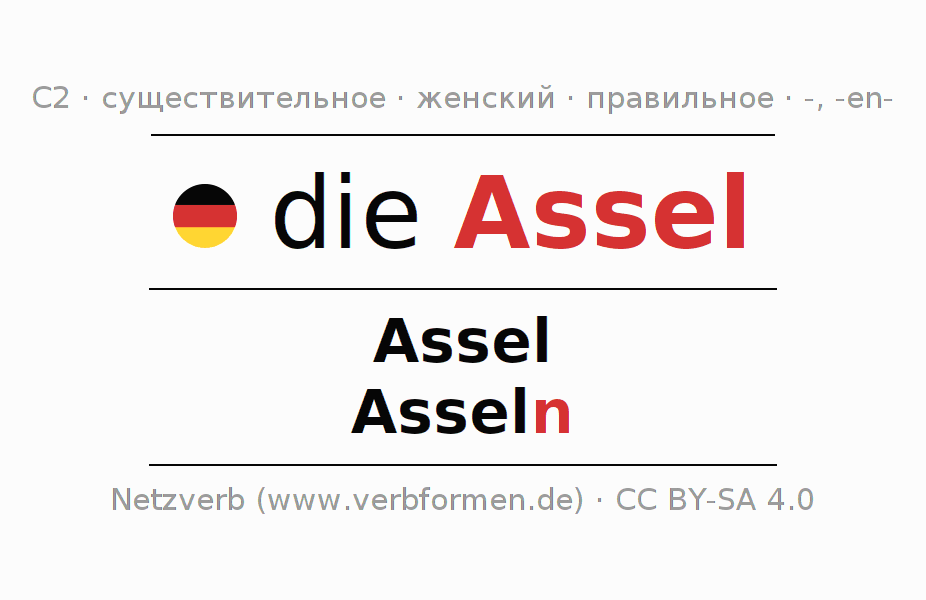 Склонение слова Assel онлайн представлено в виде сводной таблицы со всеми формами единственного и множественного числа (множественное число) во всех четырех падежах - именительном (номинатив или 1-й падеж - кто? что?), родительном (генитив или 2-й падеж - кого? чего? чей?), дательном (датив или 3-й падеж - кому? чему?) и винительном (аккузатив или 4-й падеж - кого? что?). Материалы по склонению существительного ... могут быть использованы в качестве пособия при подготовке домашних заданий, проведении экзаменов, контрольных работ, при преподавании немецкого языка в школе, изучении немецкого языка как иностранного (DaF) и как второго (DaZ), а также при обучении взрослых. Для изучающих немецкий язык знание правильного склонения слова Assel имеет важное значение. Более подробную информацию Вы найдёте на ... викисловаря ... и на ... в Дудене.