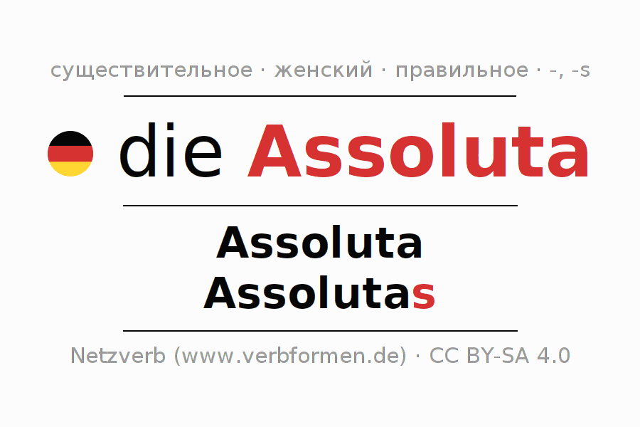 Склонение существительного Assoluta (примадонна) даётся в родительном падеже единственного числаAssoluta и в именительном падеже множественного числа Assolutas. Существительное Assoluta склоняется по сильному типу, получая окончания -/s. Грамматический род Assoluta женский с определённым артиклем "die" Здесь можно просклонять не только Assoluta, но и все немецкие существительные. Kомментарии ☆