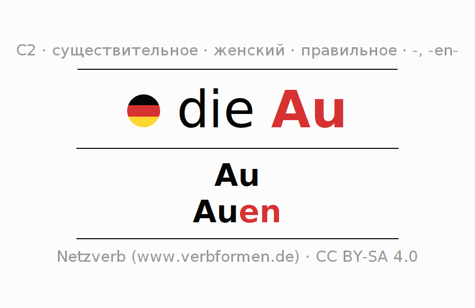 Склонение существительного Au (зелёный о́стров, луг) даётся в родительном падеже единственного числаAu и в именительном падеже множественного числа Auen. Существительное Au склоняется по слабому типу, получая окончания -/en. Грамматический род Au женский с определённым артиклем "die" Здесь можно просклонять не только Au, но и все немецкие существительные. Существительное включён в словарный запас обладателя сертификата знания немецкого языка уровня C2. Kомментарии ☆