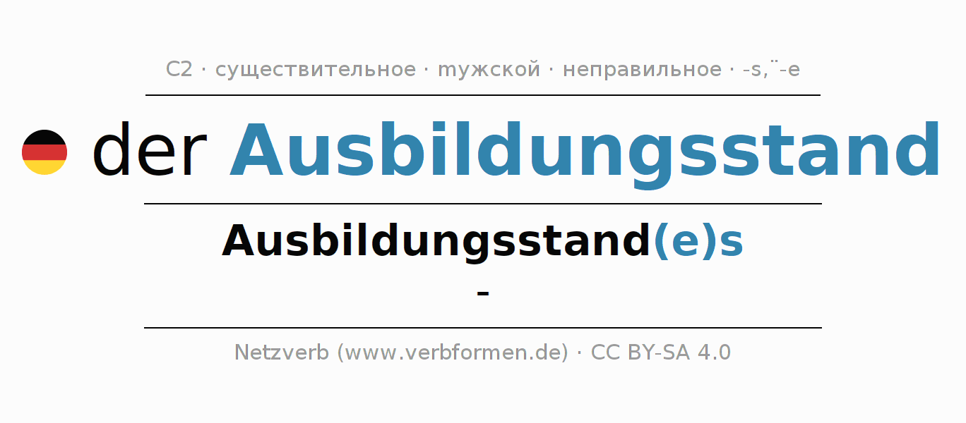 Склонение существительного Ausbildungsstand (стадия обучения, у́ровень образова́ния) даётся в родительном падеже единственного числаAusbildungsstand(e)s и в именительном падеже множественного числа -. Существительное Ausbildungsstand склоняется по сильному типу, получая окончания es/-. Во множественном числе стоит умлаут. Не образует форм множественного числа. Грамматический род Ausbildungsstand мужской с определённым артиклем "der" Здесь можно просклонять не только Ausbildungsstand, но и все немецкие существительные. Существительное включён в словарный запас обладателя сертификата знания немецкого языка уровня C2. Kомментарии ☆